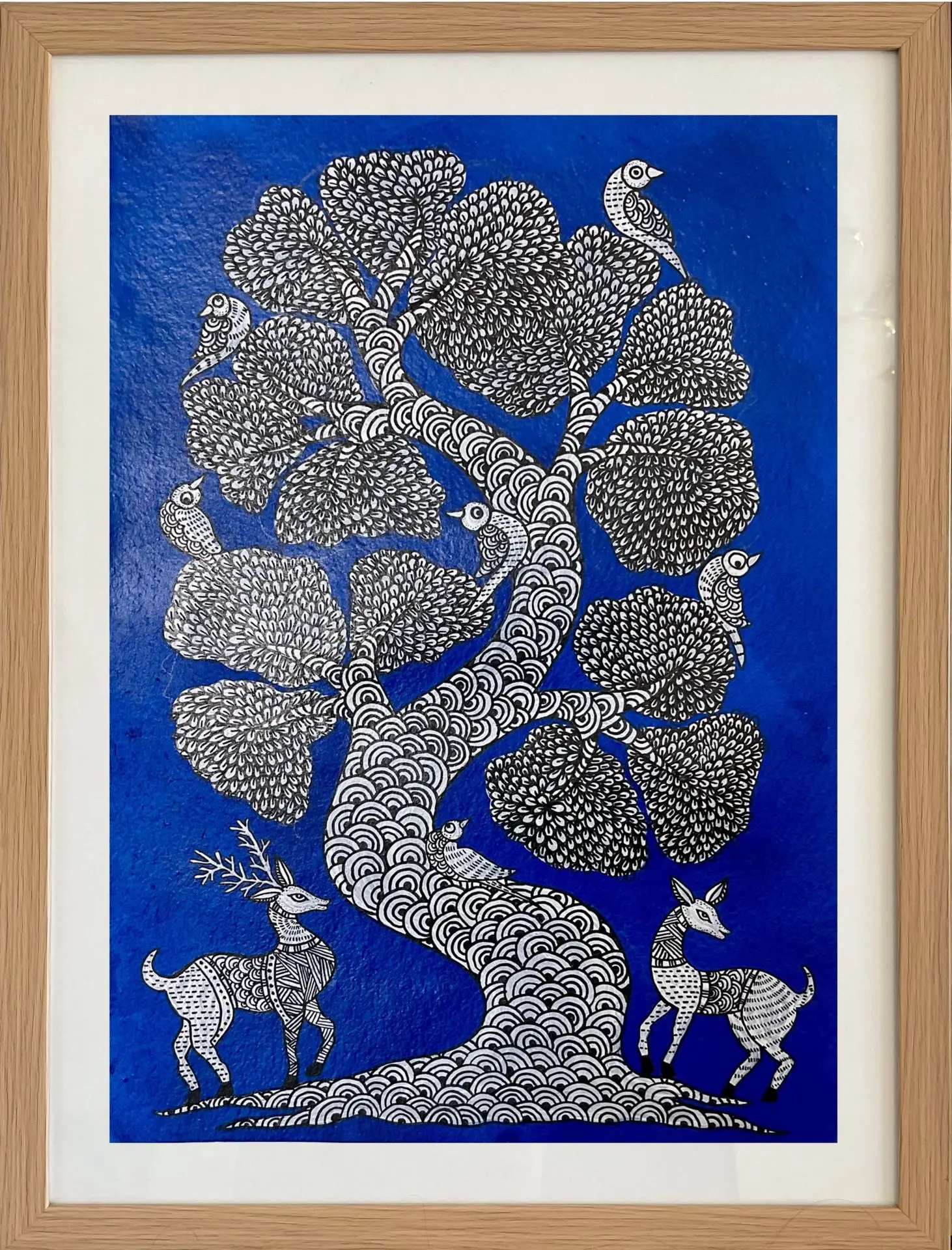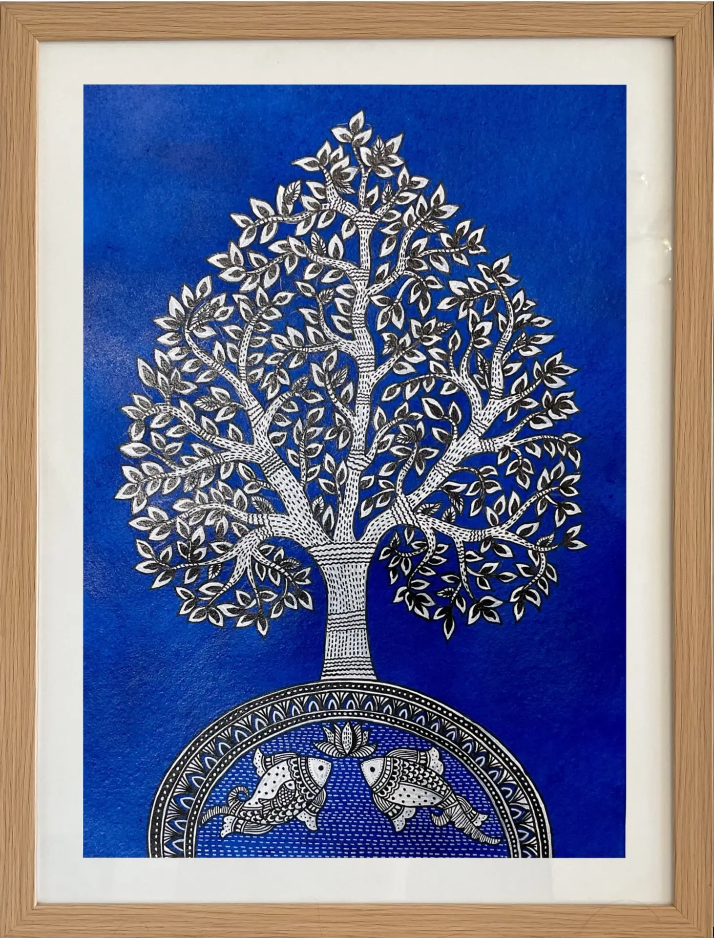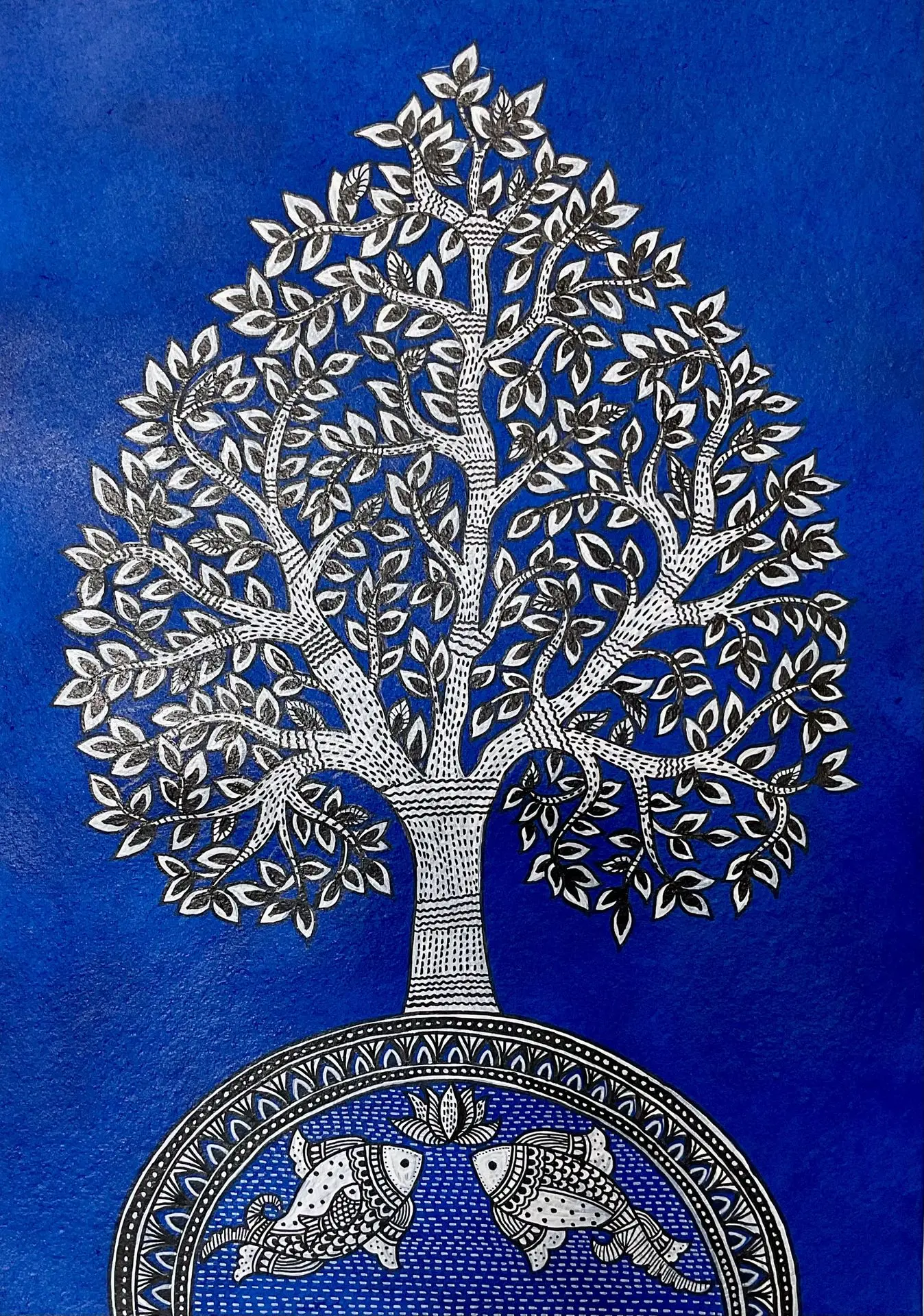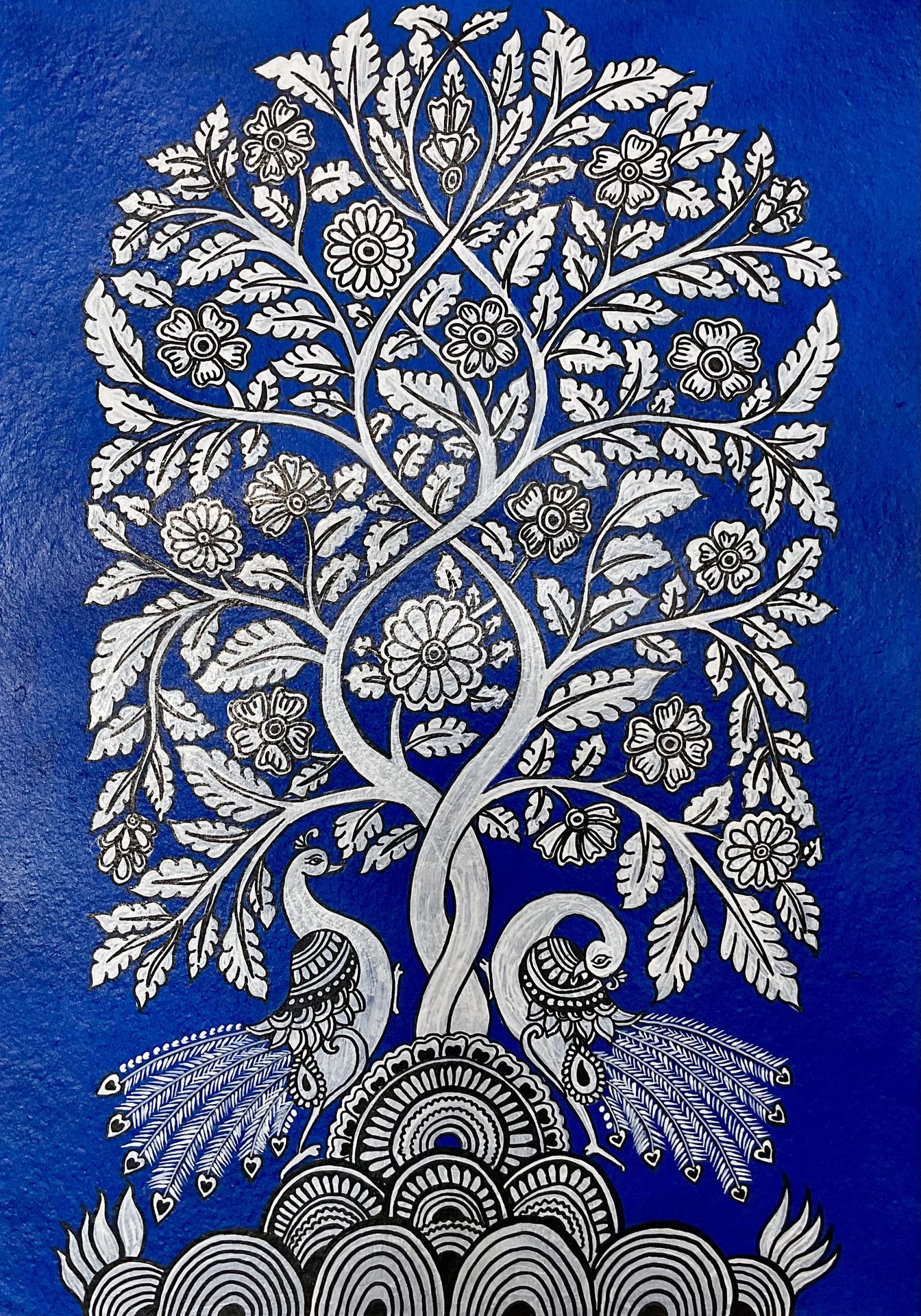 The Tree of Life, or The wish fulfilling Tree, symbolizes growth, prosperity, and our connection with nature. I reimagine this motif through the Indian Artforms Madhubani, Kalamkari, and Gond, letting blue become the thread that unites these forms.