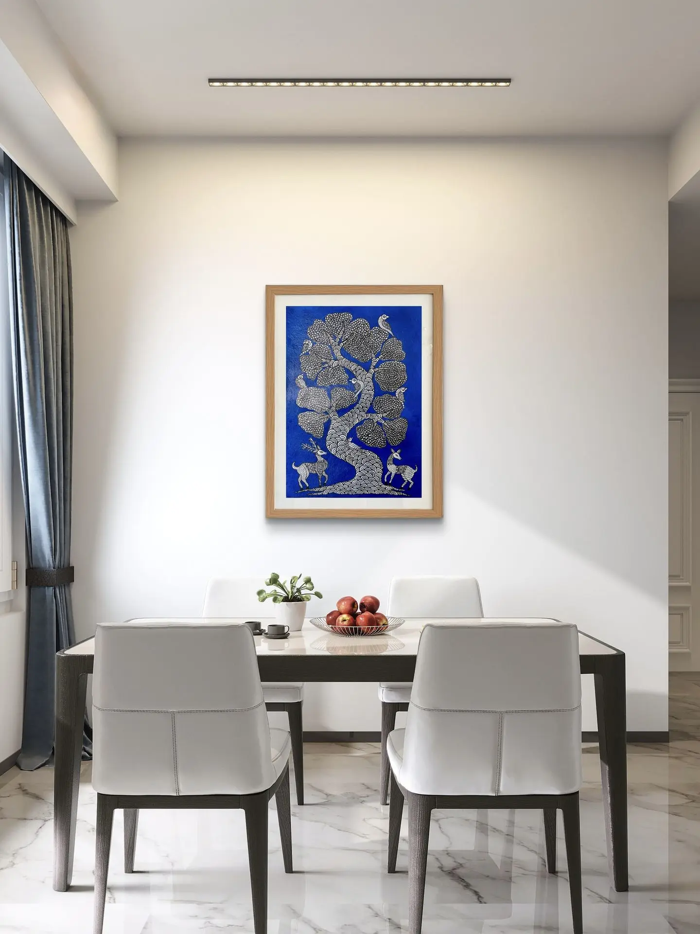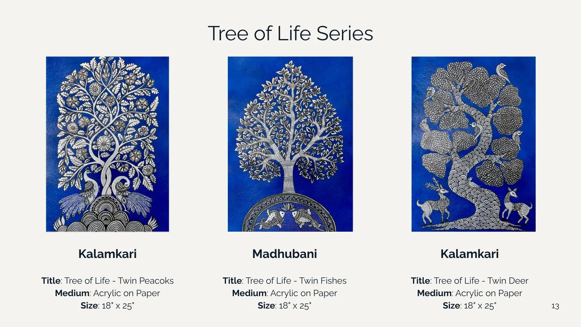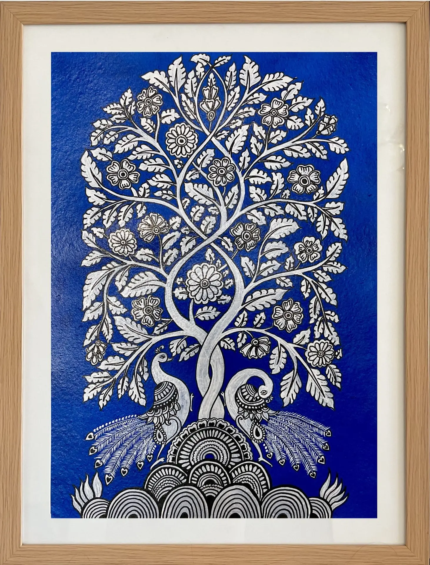 The Tree of Life, or The wish fulfilling Tree, symbolizes growth, prosperity, and our connection with nature. I reimagine this motif through the Indian Artforms Madhubani, Kalamkari, and Gond, letting blue become the thread that unites these forms.