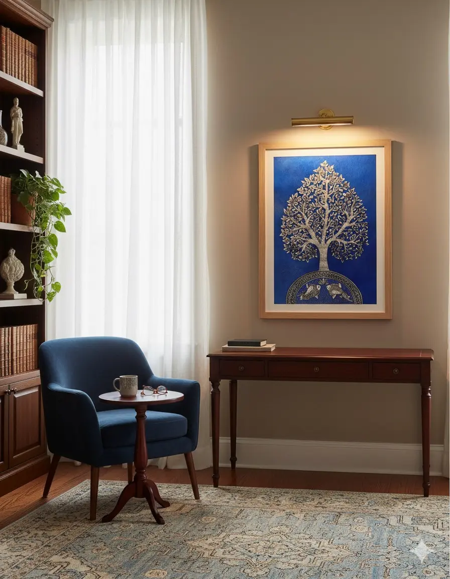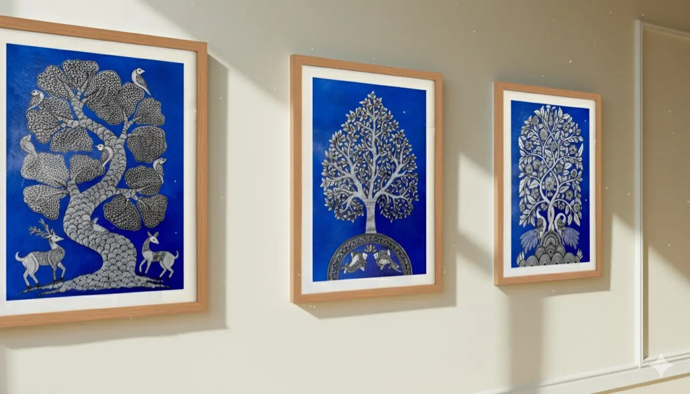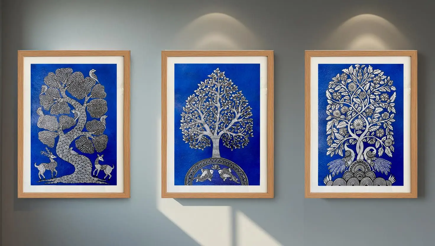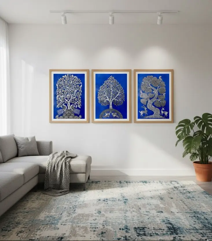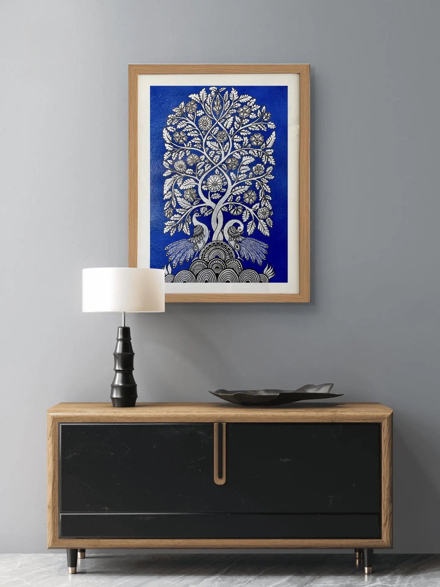 The Tree of Life, or The wish fulfilling Tree, symbolizes growth, prosperity, and our connection with nature. I reimagine this motif through the Indian Artforms Madhubani, Kalamkari, and Gond, letting blue become the thread that unites these forms.