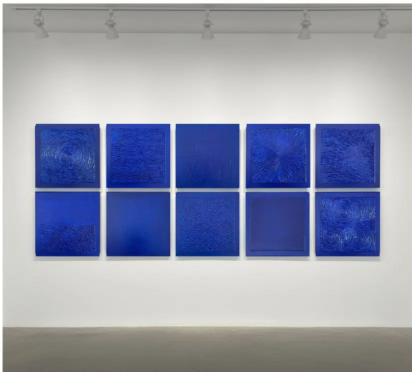 Ten textured explorations of blue, and three reinterpretations of Indian art traditions,