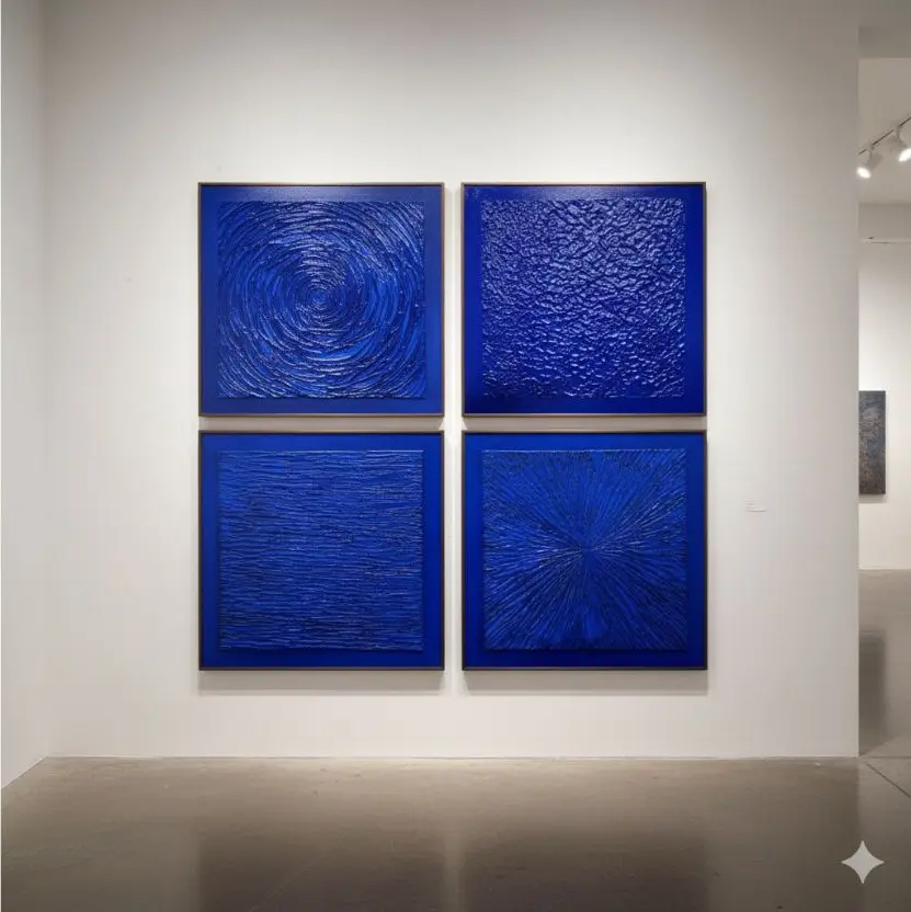 Through textured canvases, I study how light, depth, and texture change the emotional experience of a single hue. Each one a different conversation with a colour that refuses to be Just one thing.